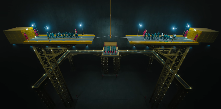 10명씩 한조가 되어 타워 위에서 줄을 당겨 상대팀을 추락시켜야 이기는 게임, 주인공인 성기훈 팀은 노인, 여자가 포함되어 있고 상대팀은 남자들뿐이라 자칫 질수도 있었지만 오일남 할아버지의 버티기 공략으로 승리하게 됩니다. 참가자 80명 중 40명 생존, 40명 탈락
