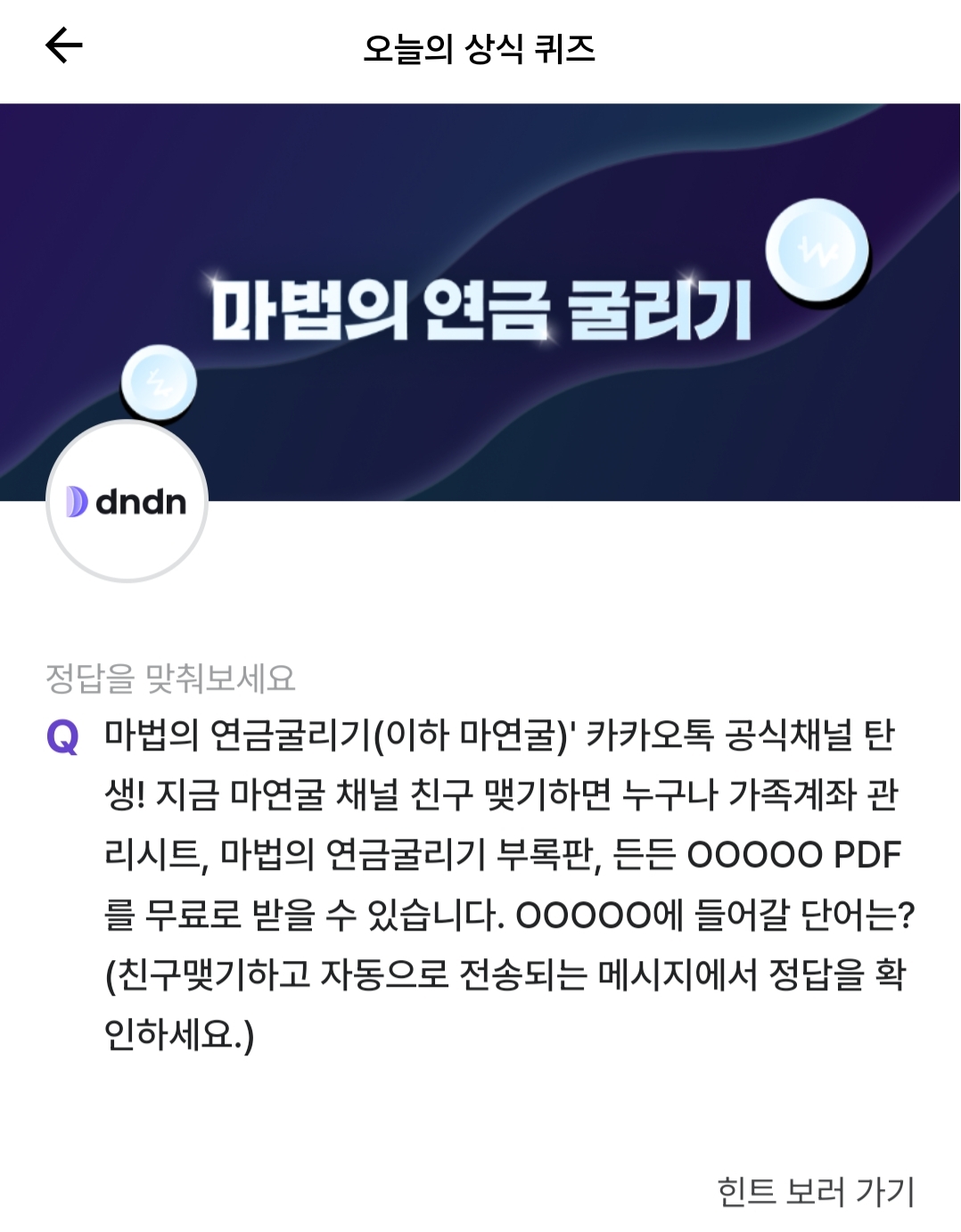 Q. 마법의 연금굴리기(이하 마연굴)'카카오톡 공식채널 탄생! 지금 마연굴 채널 친구 맺기하면 누구나 가족계좌 관리시트, 마법의 연금굴리기 부록판, 든든 0000 PDF를 무료로 받을 수 있습니다