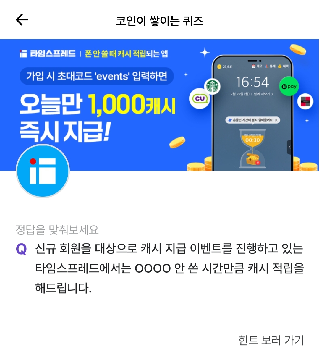 Q. 신규 회원을 대상으로 캐시 지급 이벤트를 진행하고 있는 타임스프레드에서는 0000 안 쓴 시간만큼 캐시 적립을 해드립니다.