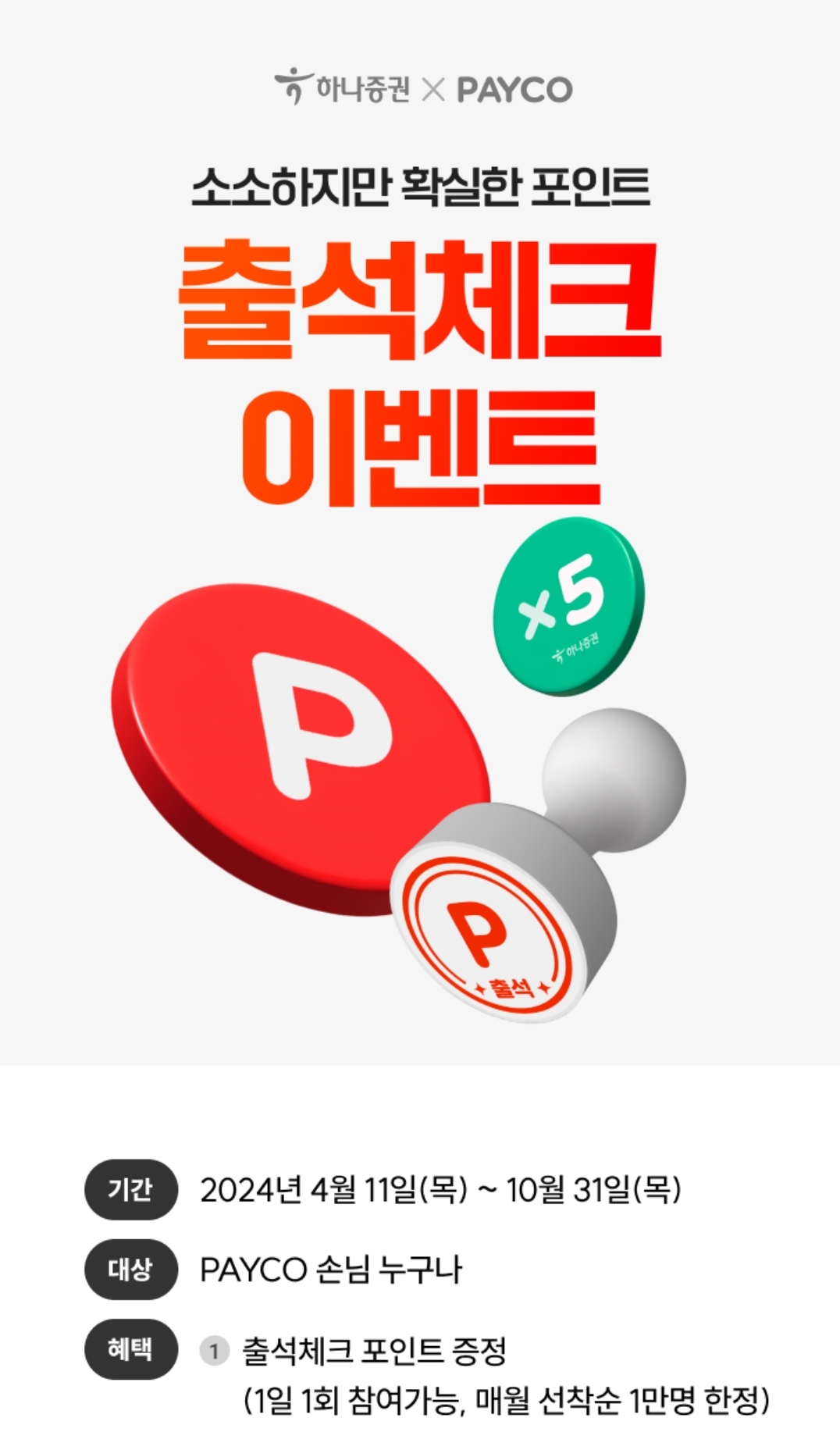 [페이코×하나증권] 소소하지만 확실한 포인트 (~10/31) 매일응모 출석체크