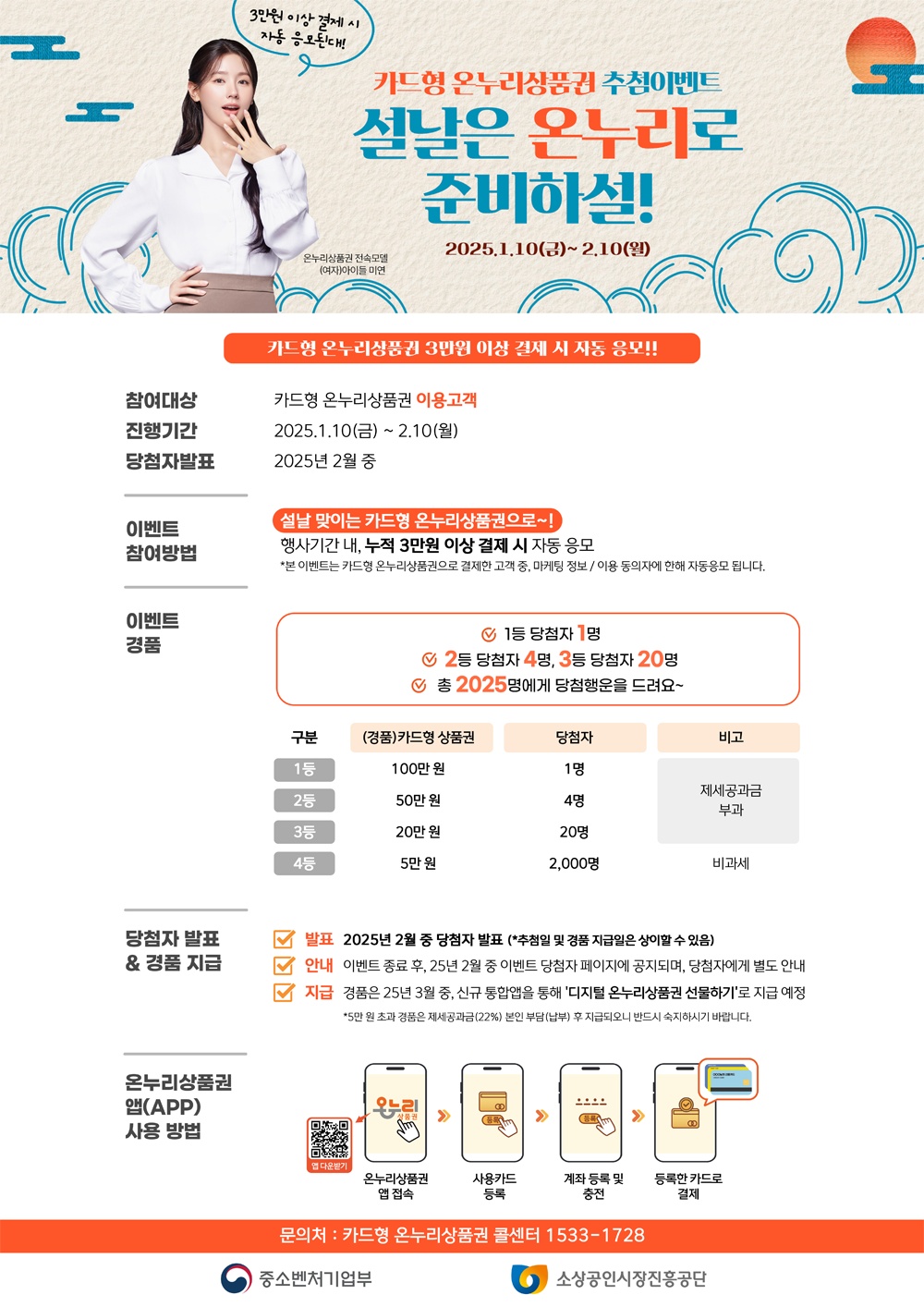 디지털 온누리상품권(모바일, 카드형) 으로 누적 3만원 이상 결제 시 자동으로 응모되는 이벤트가 있습니다.