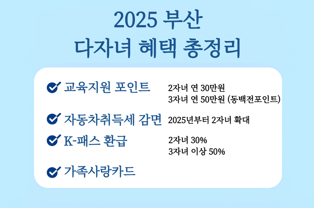 2025년 부산 다자녀 혜택은 교육비·교통비 절감은 물론, 자동차 세금 감면과 문화·체육생활 할인까지 다양한 분야에 걸쳐 강화되었습니다.
